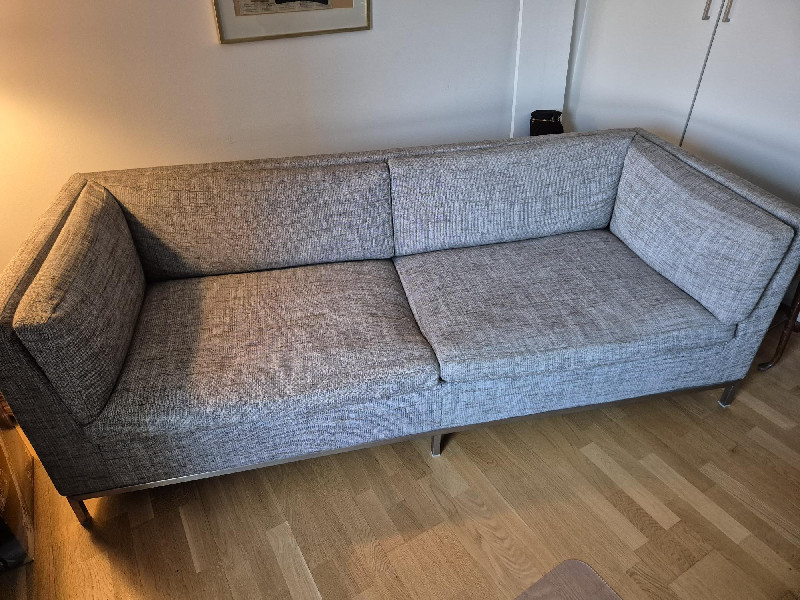 Meget velholdt sofa 200x80x68 i gråmeleret, slidstærkt stof, der passer til enhver bolig. Ingen huller, slidspor eller pletter. Købt hos møbelhandler i Aarhus i begyndelsen af 10'erne. Klassisk siddestilling, der ikke er som de nuværende meget umage chaiselonger. Personer på op til 180 cm ligger godt i den. Skal afhentes på adressen, men der er elevator for nedbringelse til gaden. Perfekt også til værelser.