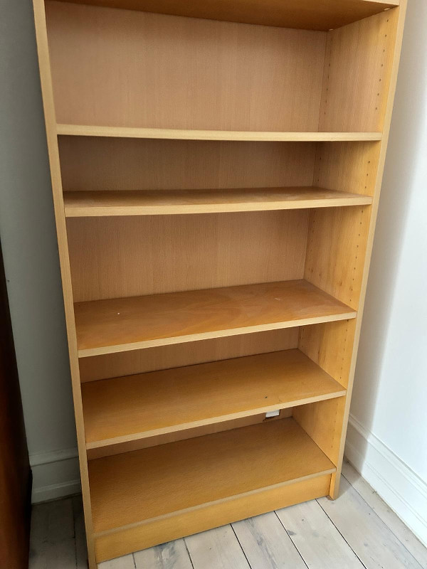 Udmærket reol. Hul nederst for at gøre plads til en elkontakt i sin tid. Kan ikke ses, når der er ting på hylden.